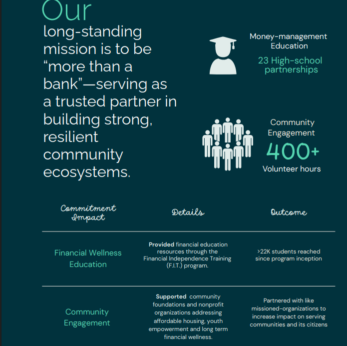We are committed and continue to promote community economic growth and stability. We believe that taking care of our customers and the community through personalized engagement: we create a win for everyone. Our conscious contributions will continue to enhance our performance